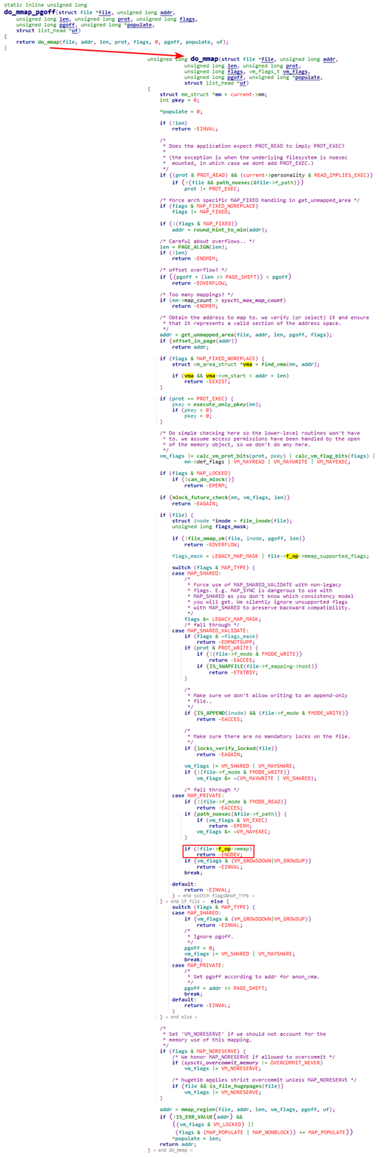 从调用关系中可见,如果mmap函数未被实现,当用户进行mmap系统调用时,会返回-ENODEV