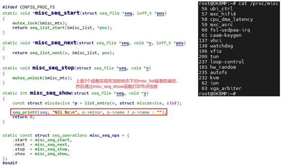 说明1:misc_init函数中注册了/proc/misc文件,读取该文件可以获得当前系统中注册的misc设备