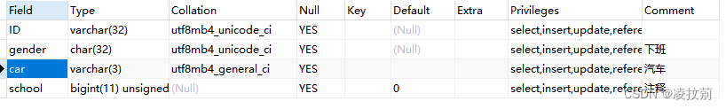 ALTER TABLE 表名 ADD COLUMN 字段名称 字段类型(字段长短-选填) CHARACTER SET utf8mb4 COLLATE utf8mb4_general_ci NOT NULL(是否不可为空) DEFAULT 0(默认值) COMMENT '备注' AFTER 在指定字段之后(不加默认最后); 列子1