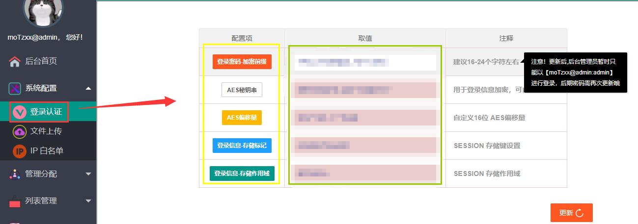 > 其对应的配置文件为: "/config/sys_auth.php" ;> 注意截图中的提示信息,方便后期安全性的更新操作!