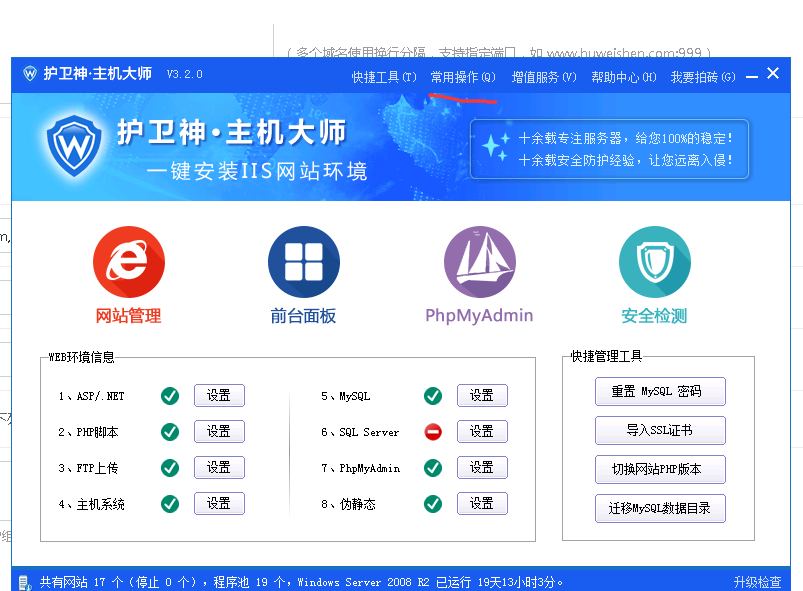 在护卫神主机大师中打开常用操作里的打开IIS管理器