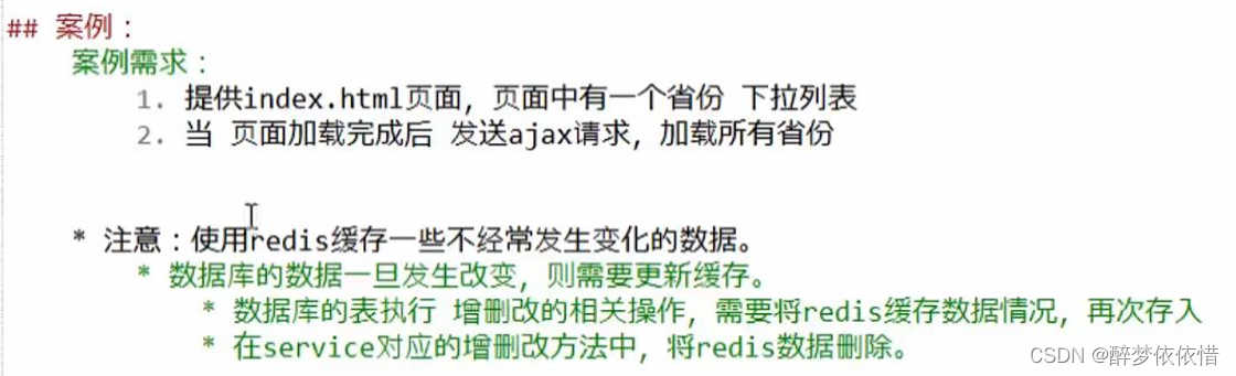 public class ProvinceServiceImpl implements ProvinceService {private ProvinceDao dao = new ProvinceDaoImpl();@Overridepublic List<Province> findAll() {return dao.findAll();}@Overridepublic String findAllJson() throws IOException {//1.先从redis中查询数据//1.1获取Redis客户端连接Jedis jedis = JedisPoolUtils.getJedis();String province_json = jedis.get("province");//将这个键删除,就删除了redis缓存数据了//2.判断province_json 数据是否为nullif (province_json == null || province_json.length() == 0){System.out.println("redis中没有数据,查询数据库...");//1.redis中没有数据//2.1从数据库查询数据List<Province> ps = findAll();//2.2将list序列化为jsonObjectMapper mapper = new ObjectMapper();province_json = mapper.writeValueAsString(ps);//2.3将json数据存入redisjedis.set("province",province_json);//归还连接jedis.close();}else {System.out.println("redis中有数据,查询缓存...");}return province_json;}