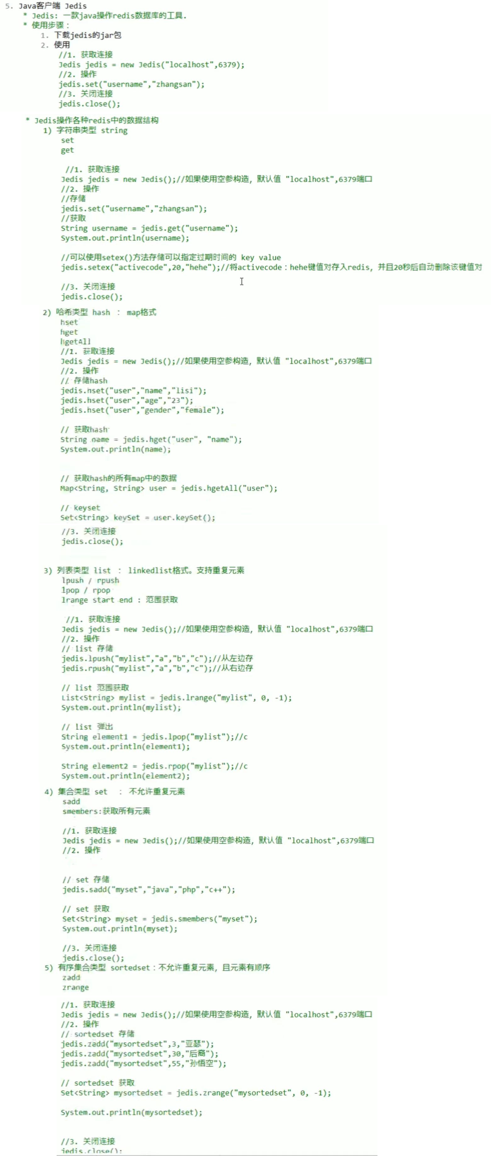 public class JedisTest {/*** 快速入门*/@Testpublic void test1(){//1.获取连接Jedis jedis = new Jedis("locathost",6379);//2.操作jedis.set("username","zhangsan");//3.关闭连接jedis.close();}/*** string 数据结构操作*/@Testpublic void test2(){//1.获取连接Jedis jedis = new Jedis();//如果使用空参构造,默认值:"locathost",6379端口//2.操作//存储jedis.set("username","zhangsan");//获取String username = jedis.get("username");System.out.println(username);//可以使用setex()方法存储可以指定过期时间的 key value//将activecode:hehe 键值对存入Redis,并且20秒后自动删除该键值对jedis.setex("activecode",20,"hehe");//3.关闭连接jedis.close();}/*** hash 数据结构操作*/@Testpublic void test3(){//1.获取连接Jedis jedis = new Jedis();//如果使用空参构造,默认值:"locathost",6379端口//2.操作//存储hashjedis.hset("user","name","lisi");jedis.hset("user","age","23");jedis.hset("user","gender","male");//获取hashString name = jedis.hget("user", "name");System.out.println(name);//获取hash的所有map中的数据Map<String, String> user = jedis.hgetAll("user");Set<String> keySet = user.keySet();for (String key:keySet) {//获取valueString value = user.get(key);System.out.println(key+":"+value);}//3.关闭连接jedis.close();}/*** list 数据结构操作*/@Testpublic void test4(){//1.获取连接Jedis jedis = new Jedis();//如果使用空参构造,默认值:"locathost",6379端口//2.操作//list存储jedis.lpush("mylist","a","b","c");//从左边存jedis.rpush("mylist","d","e","f");//从右边存//list 范围获取List<String> mylist = jedis.lrange("mylist", 0, -1);System.out.println(mylist);//[c, b, a, d, e, f]//list 弹出String element1 = jedis.lpop("mylist");String element2 = jedis.rpop("mylist");System.out.println(element1);System.out.println(element2);//list 范围获取List<String> mylist2 = jedis.lrange("mylist", 0, -1);System.out.println(mylist2);//[b, a, d, e]//3.关闭连接jedis.close();}/*** set 数据结构操作*/@Testpublic void test5(){//1.获取连接Jedis jedis = new Jedis();//如果使用空参构造,默认值:"locathost",6379端口//2.操作//set存储jedis.sadd("myset","java","php","c++");//set 获取Set<String> myset = jedis.smembers("myset");System.out.println(myset);//3.关闭连接jedis.close();}/*** zset(sortedset) 数据结构操作*/@Testpublic void test6(){//1.获取连接Jedis jedis = new Jedis();//如果使用空参构造,默认值:"locathost",6379端口//2.操作//sortedset存储jedis.zadd("myzset",1,"亚瑟");jedis.zadd("myzset",2,"后裔");jedis.zadd("myzset",3,"孙悟空");//sortedset 获取Set<String> myzset = jedis.zrange("myzset", 0, -1);System.out.println(myzset);//3.关闭连接jedis.close();}}