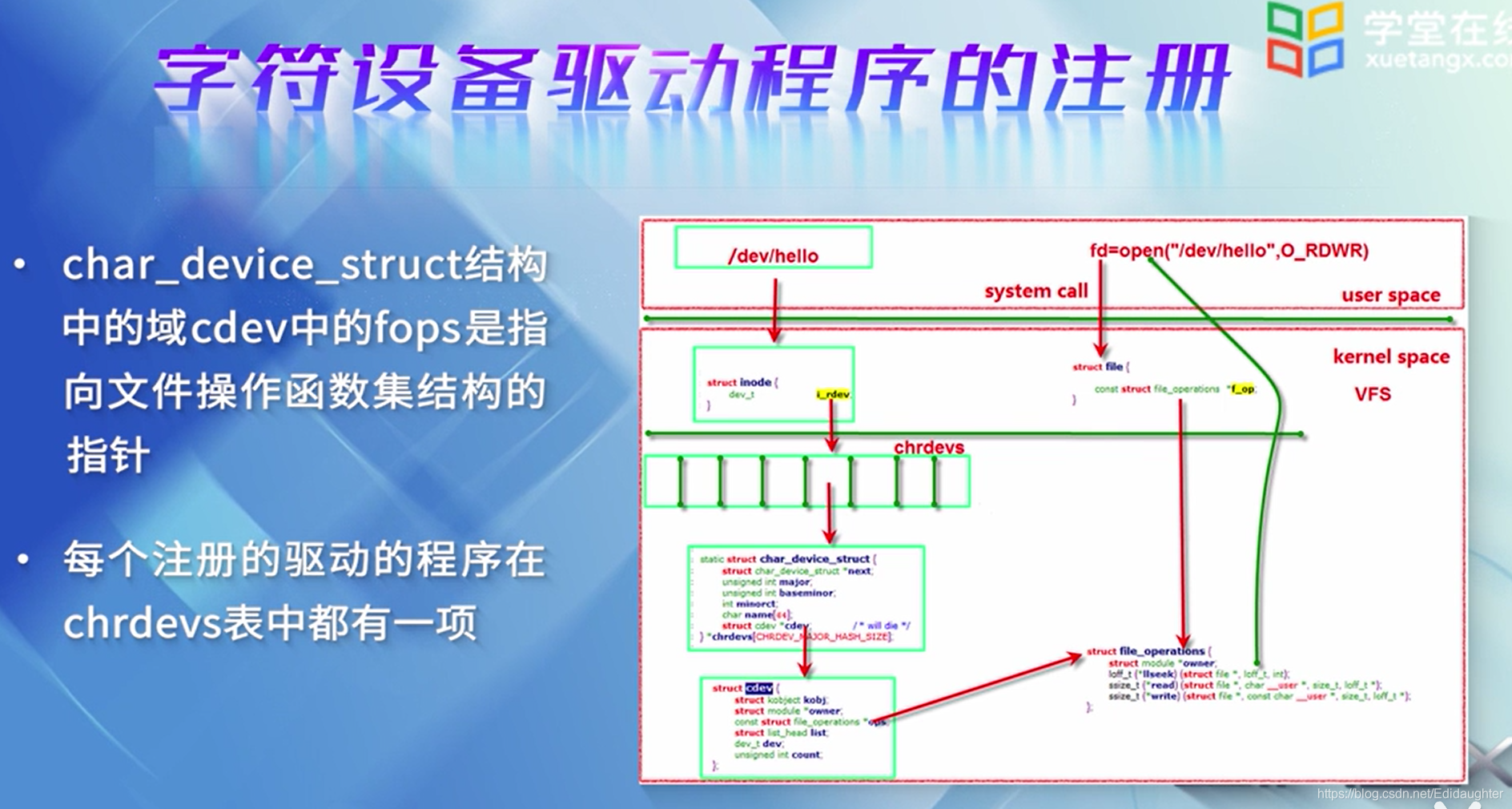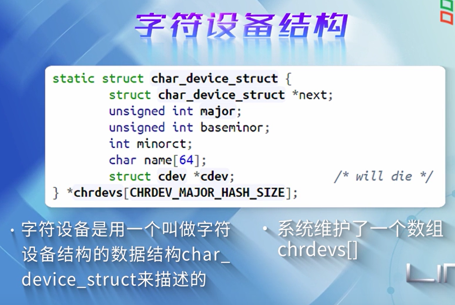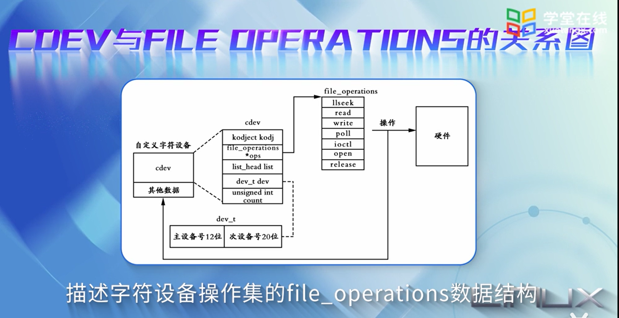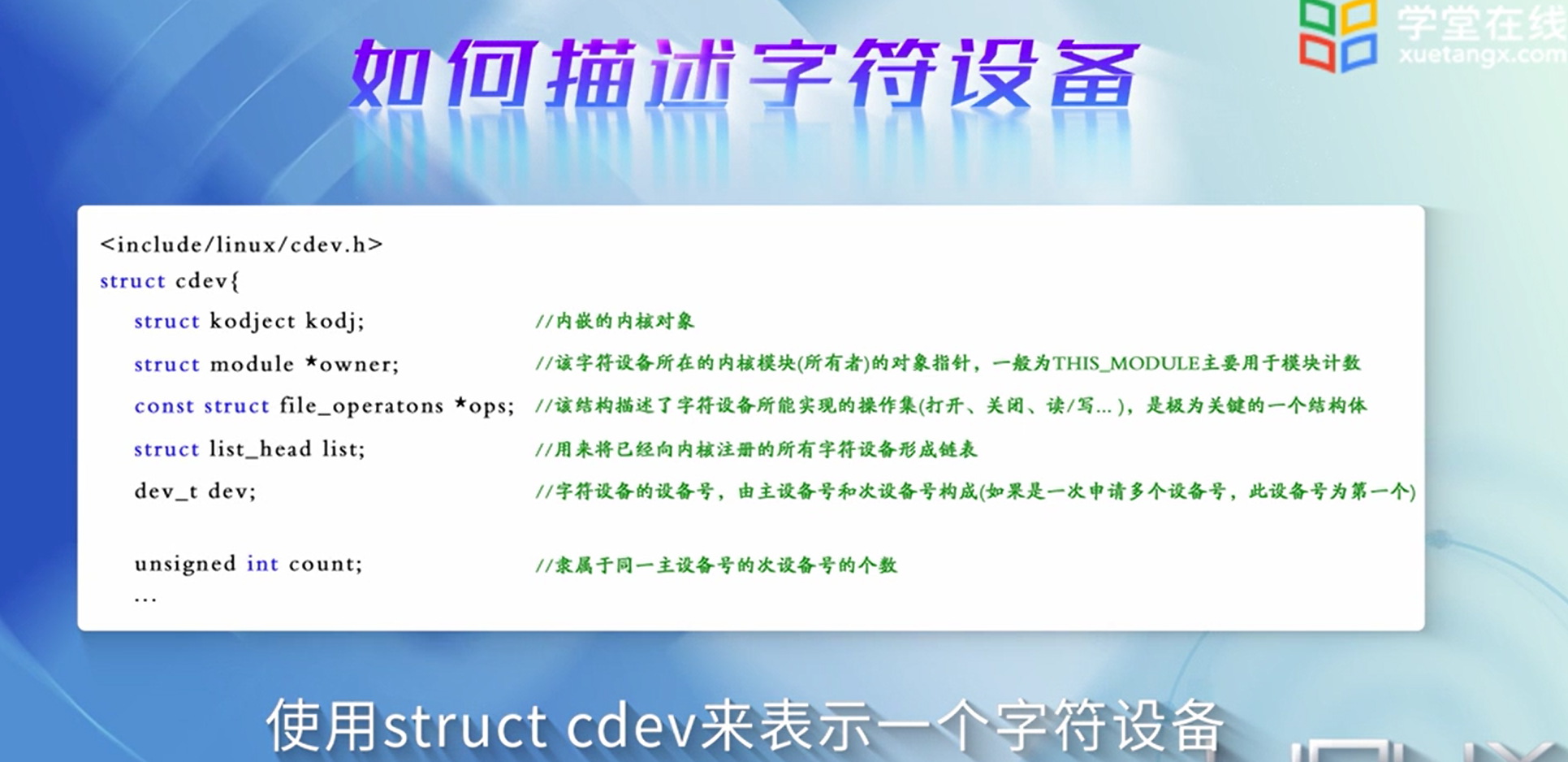 struct cdev {struct kobject kobj; // 内嵌的内核对象struct module *owner;// 该字符设备所在的内核模块(所有者)的对象指针const struct file_operations *ops;// 字符设备所能实现的操作表struct list_head list;// 用来将已经向内核注册的所有字符设备形成链表dev_t dev;//字符设备的设备号,由主设备号和次设备号构成(如果是一次申请多个设备号,此设备号为第一个),主设备号12位,次设备号20位unsigned int count; // 隶属于同一主设备号的次设备号的个数