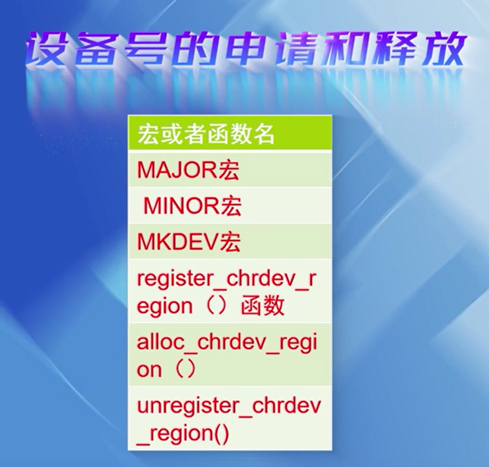 型的设备,在这里给出三个宏和三个函数分别从设备号中提取主设备号和次设备号,将主设备号和次设