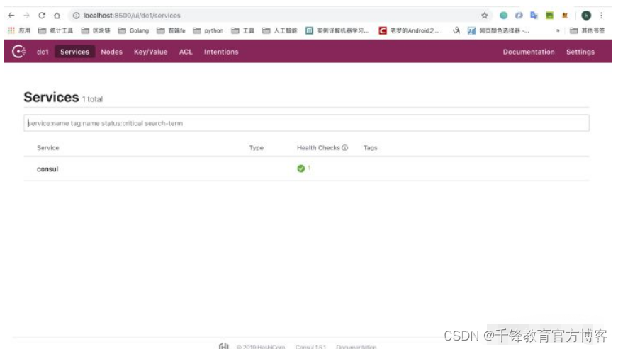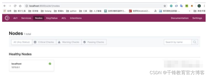 终端命令行下启动consul的dev模式后,通过members命令查看节点信息,除此以外,还可以使用Http的浏览器访问的模式,查看节点信息。 consul启动,正常运行后,打开浏览器,在地址栏中键入:http://localhost:8500。可以查看节点信息,如下图: