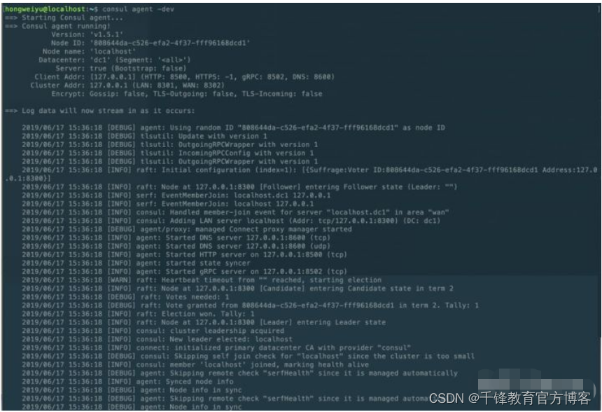 上诉consul agent -dev模式下的启动与运行consul节点。集群中只包含一个节点,唯一的节点被选举成为Leader节点。
