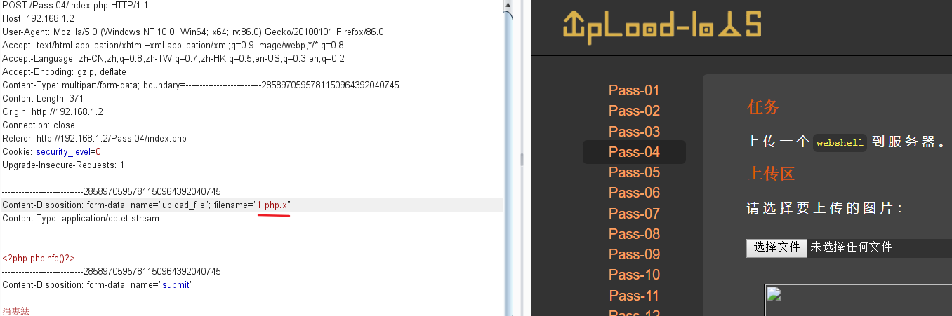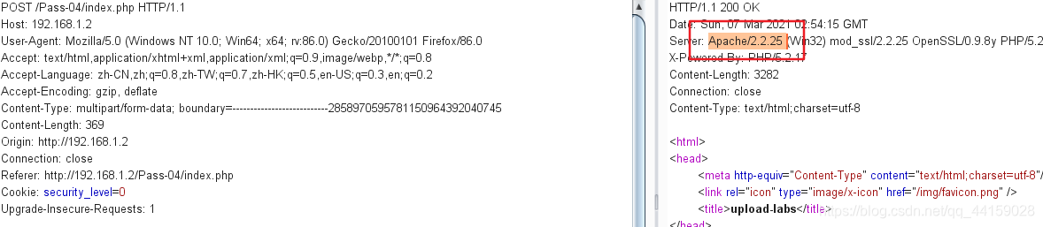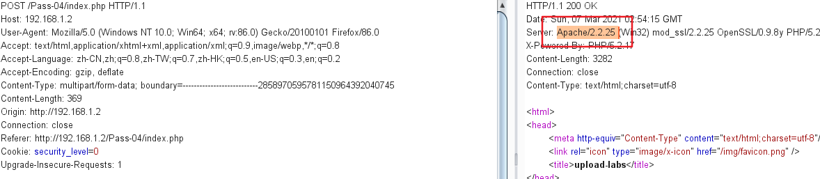 以第upload-labs第四关为例,这个漏洞对绕过文件上传限制特别有用。将文件后缀名改为 info.php.x 时上传成功。如观察到响应包apache版本为2.2.25,存在解析漏洞