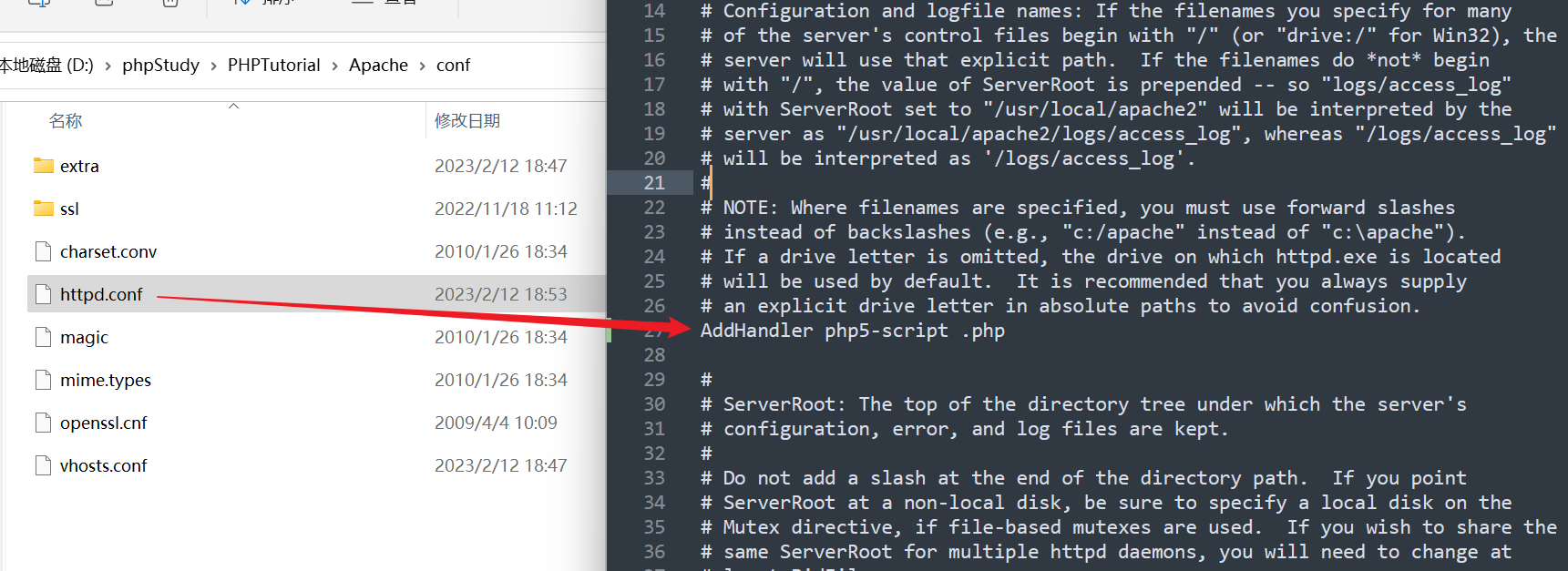 - 打开 "phpStudy\PHPTutorial\Apache\conf\httpd.conf"文件,在任意位置增加如下一行