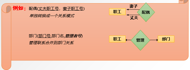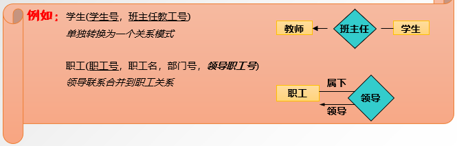 与某一端实体对应的关系模式合并,原则:合并后关系的属性=加入对应关系的码和联系本身的属性;合并后关系的码不变;