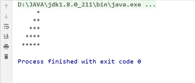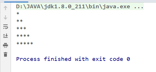 public class Demo1 {public static void main(String[] args){//外循环控制行数:5行for (int i=1;i<=5;i++) {for (int j = 1; j <= i; j++) {System.out.print("*");}//换行System.out.println();}}