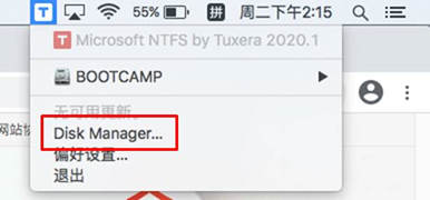 除了使用Finder应用程序打开软件外,我们也可以通过单击系统右上角状态菜单中的“T”按钮,打开Tuxera ntfs for mac的菜单选项。