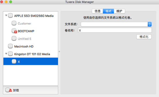 接着,如图8所示,在右侧功能面板中单击“格式”选项,进入Tuxera ntfs for mac的格式转换功能。