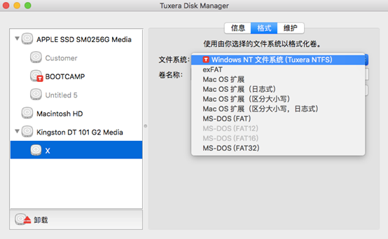 如图9所示,Tuxera ntfs for mac提供了包括NTFS、exFAT、FAT32在内的各种文件系统格式转换选项。