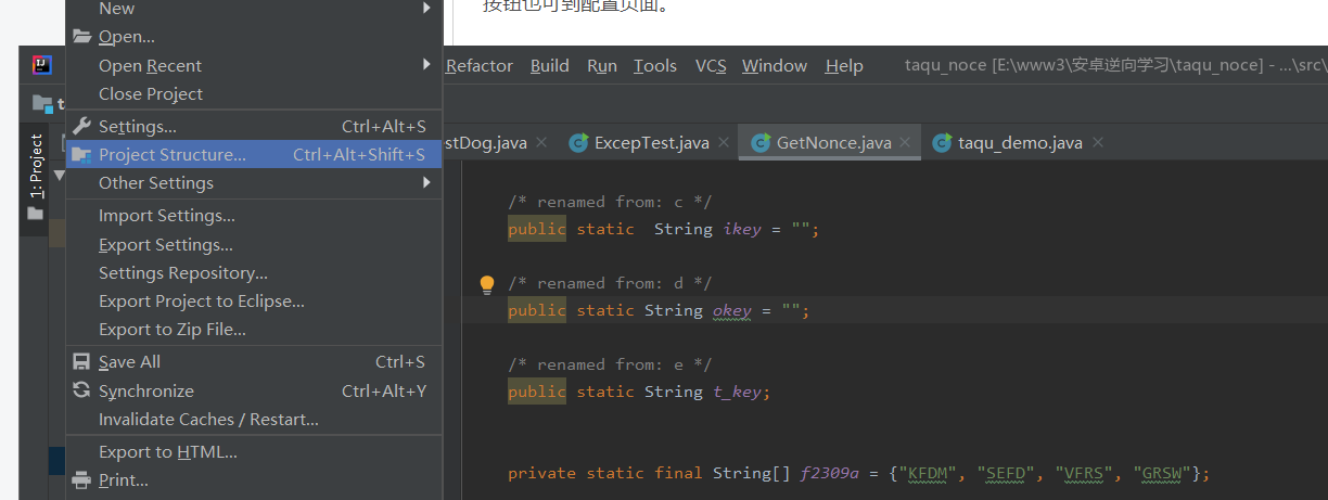 1.我们点击菜单栏中的File–>选择Project Structure…(Ctrl+Alt+Shift+S)进入到设置页面,或者在IntelliJ IDEA页面右侧点击右上角的按钮也可到配置页面。