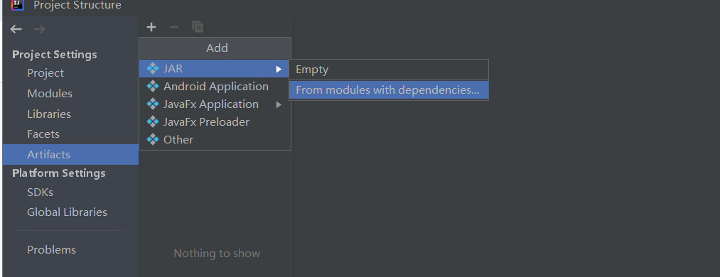 2.我们在Project Structure的设置页面选择Artifacts,然后点击右侧的绿色“+”号,接下来我们选择JAR–>From modules with dependencies…进入到设置页面。