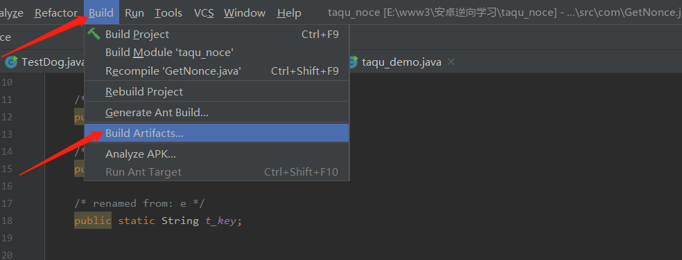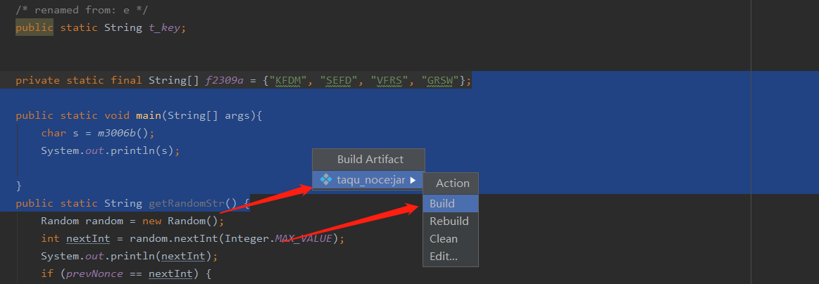 5.设置完成后我们便可以执行生成jar包的操作了,点击菜单栏中的Build–>Build Artifacts…,然后我们在下方代码区便可以看到Build Artifact,选择之前创建的Artifacts然后点击Build即可。