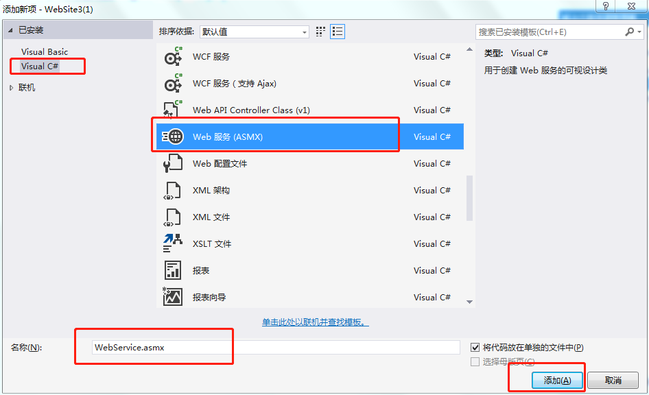选择 web服务(ASMX)点击 确定