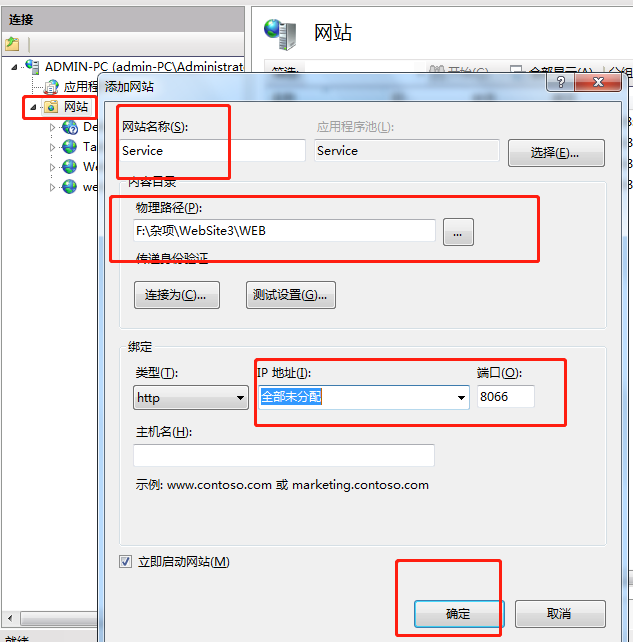 打开iis 选中网站 右键-添加网站 填写信息 物理路径 发布的文件路径