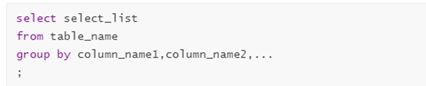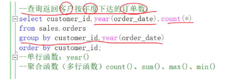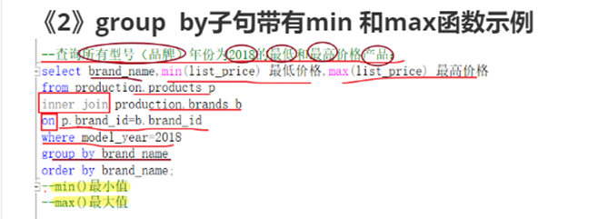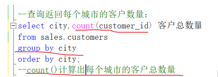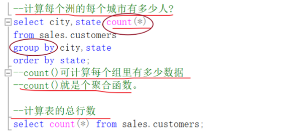 ③group by子句将行排列成组,聚合函数返回每个组的统计量(总数量、最小值、最大值、平均值、总和等)
