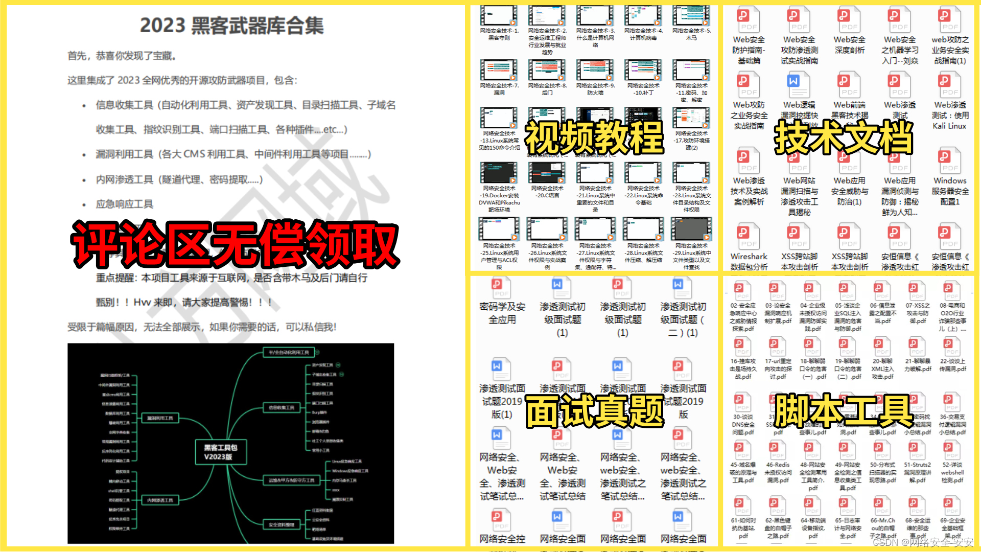 最后,也给认真阅读我文章的小伙伴准备了一份见面礼,一份100G的网络安全资料包,包括视频、书籍、面试题、工具包、hvv和等保测评文档等,应有尽有,有需要的小伙伴可以微信扫描下方CSDN官方认证二维码免费领取【保证100%免费】