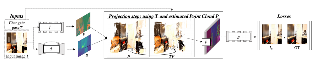 首先将图片输入特征和深度网络得到特征map和深度图,接着通过相机参数变换为带特征的点云,接着根据相对变换矩阵T,将带特征的点云渲染到二维像素位置上,接着通过一个GAN生成最终的新视角图片。