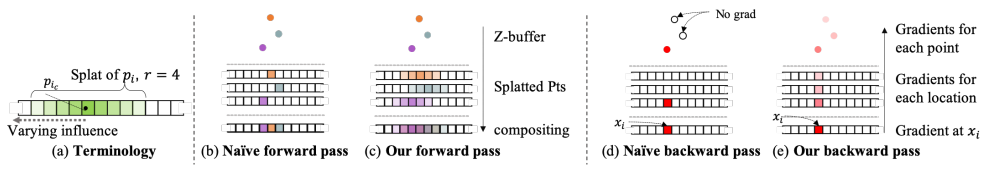 该论文的渲染方式值得关注,其并不是简单的使用zbuffer和固定投影像素位置渲染的,在z深度和平面广度上都是软映射的。