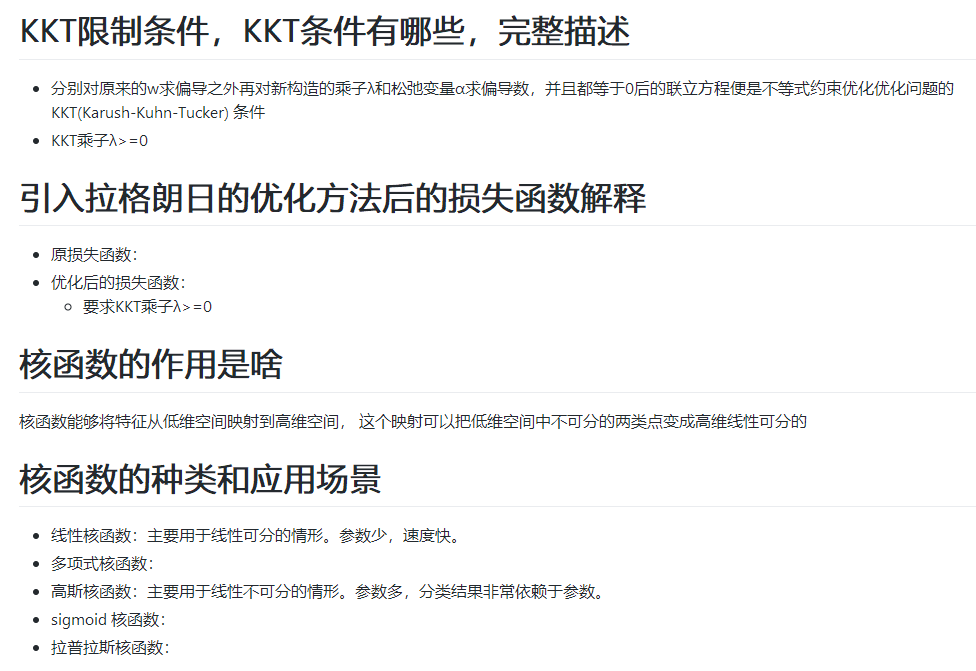 关于KKT限制条件,KKT条件有哪些、引入拉格朗日的优化方法后的损失函数解释、核函数的作用是啥、核函数的种类和应用场景作者都有详细解释。