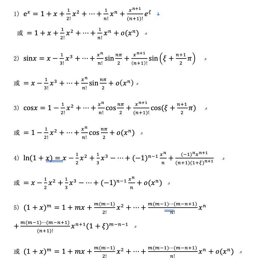 泰勒公式一句话描述:就是用多项式函数去逼近光滑函数。常见的泰勒公式有:
