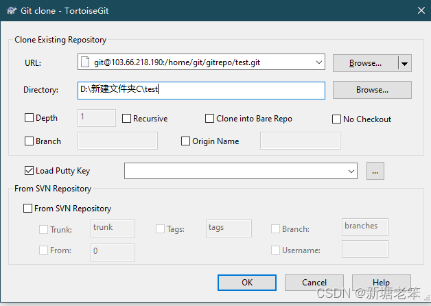如果这时直接点击OK,那么会有输入远端git用户密码的提示框,因为远端已经有本地机的公钥了,这显然不符合常理。这一点TortoiseGit和Git bash不一样,需要另外加载私钥。