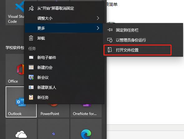 1.打开开始菜单 右键outlook的图标 就可以打开文件位置
