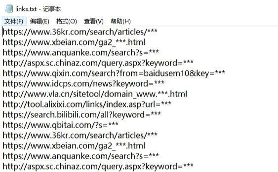 说明:图片中外链网址为一行一个,网址中的 *** 代表网址参数,您发现新的外链网址时,您只需测试查询之后,将该查询网址结果 URL 地址中的网址替换为 *** 就可以复制过来了。同样,如果发现某个外链网址已经失效,只需要打开该 txt 文本文件,搜索下,删除对应网址的那一行就可以了