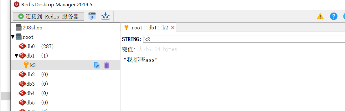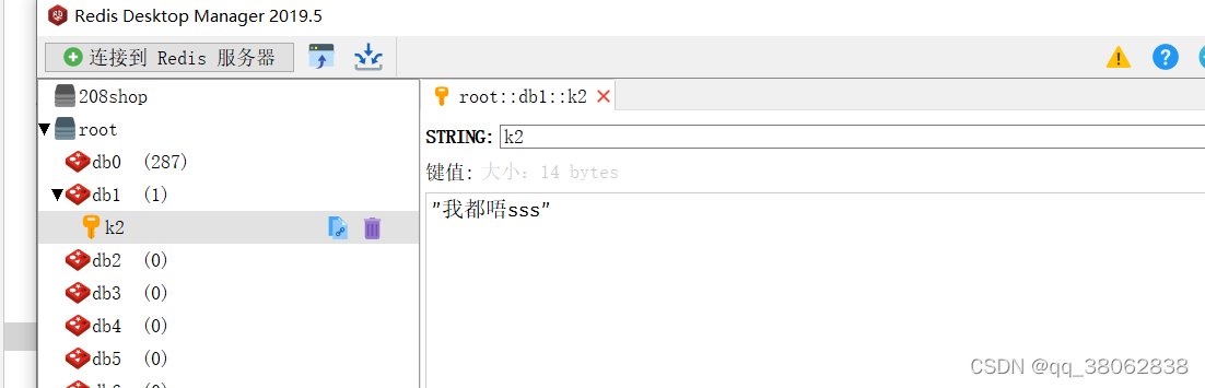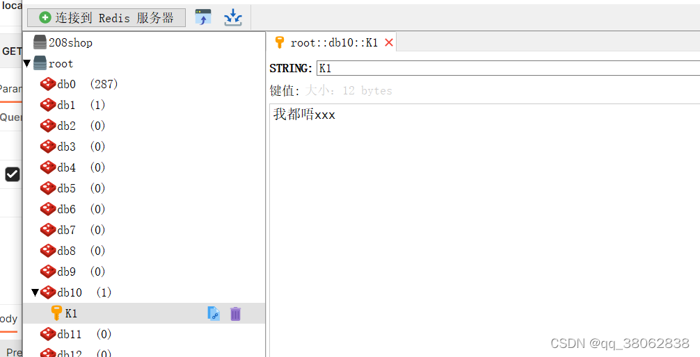 //redis 数据结构配置@Autowiredprivate redisDbConfig redisDb;/*** 添加字符串** @param key*/@GetMapping("/hi")@ResponseBodypublic void demo03(String key) {//配置结构 表示你想配置切换的db几 getRedisTemplate(1) 如果不写默认为db0redisDb.getRedisTemplate(1).opsForValue().set("k2",key);System.out.println(key);}