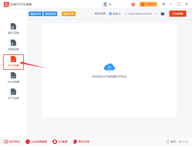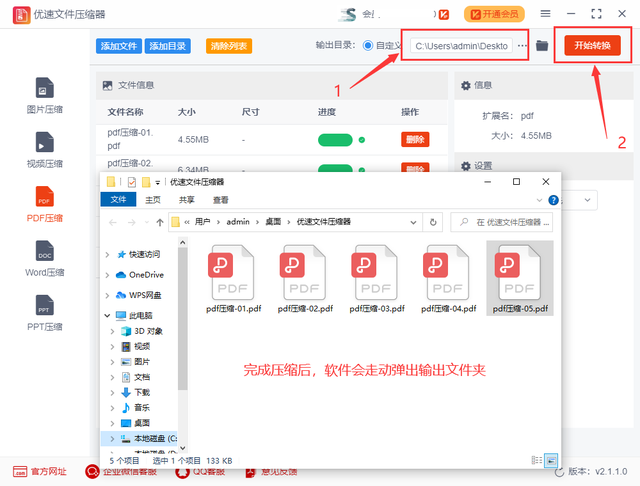 步骤3,先设置输出目录文件夹,用来保存压缩后的pdf文件。最后点击右边的【开始转换】红色按钮,启动pdf压缩,压缩完成后软件会自动弹出输出文件夹,压缩后的pdf文件全部会保存在这里面。