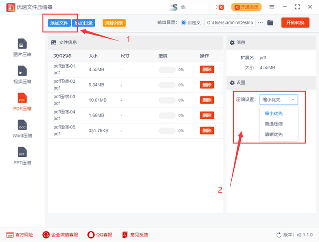 步骤2,点击左上角的【添加文件】蓝色按钮,将需要压缩的pdf文件导入到软件中,支持批量压缩,节省一点时间。然后进行压缩设置,选择一种压缩方式(支持三种压缩方式)。