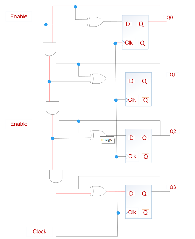 电路中有很多电路中有很多路径可以使触发器开始(Enable)或结束(Disable),其中最长的路径开始于触发器Q0结束语Q3。电路中这种最长的路径称为关键路径。如上图中红色路线,包括触发器Q0的时钟信号输出至Q的延时Tco,3个与门,1个异或门以及建立时间Tsu,所以有: