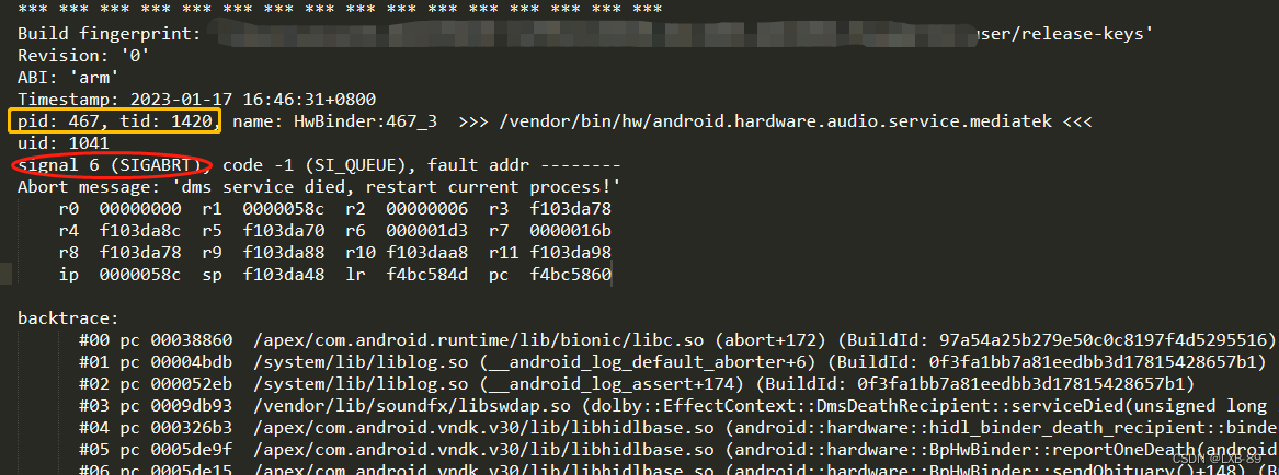 pid 和tid不同的情况,分析起来有点无从下手,但是前前后后对比日志,发现这种情况进程均为系统服务进程pid: 467, tid: 806, name: HwBinder:467_3 >>>/vendor/bin/hw/android.hardware.audio.service.mediatek <<<