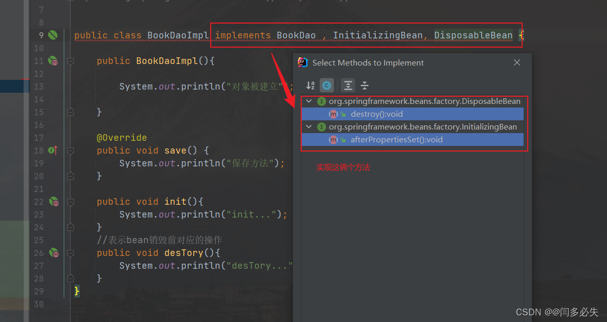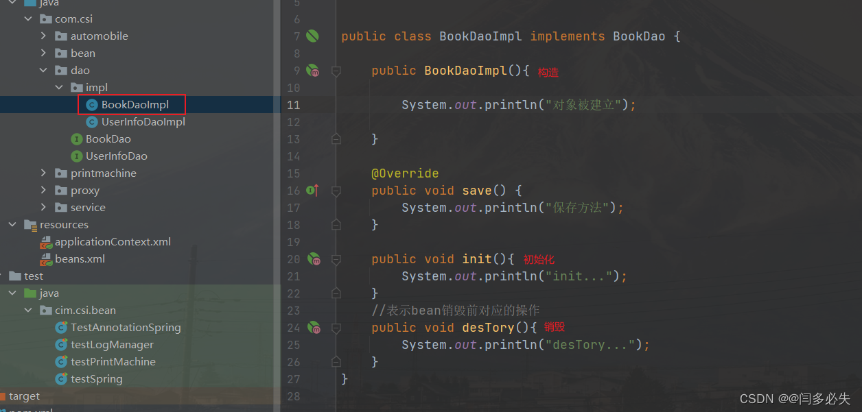 public class BookDaoImpl implements BookDao {public BookDaoImpl () {System . out . println ( "book dao constructor is running ...." );}public void save () {System . out . println ( "book dao save ..." );}}