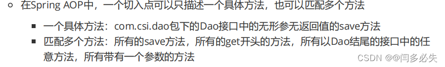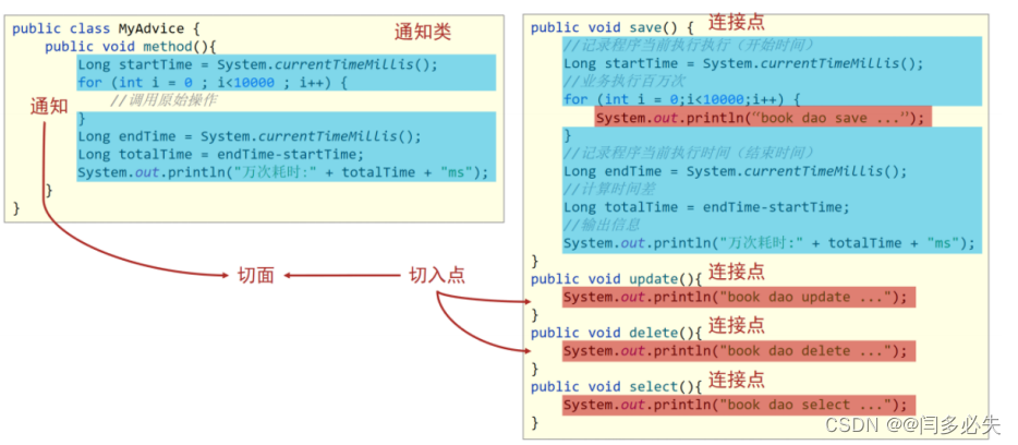 - 连接点(JoinPoint):正在执行的方法,例如:update()、delete()、select()等都是连接点。 每个方法不仅仅只有一个连接点,方法前中后都可能成为一个连接点。