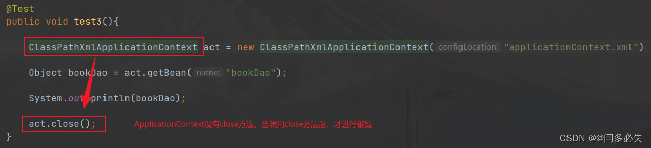 @Testpublic void testInit () {// 步骤 1 :获取到 ApplicationContext 对象//ClassPathXmlApplicationContext: 代表从类路径下加载 xml 配置文件,返回ApplicationContext 的对象ApplicationContext ctx = new ClassPathXmlApplicationContext ( "applicationContext.xml" ) ;// 步骤 2 :从 ApplicationContext 容器中获取到 userInfo 的对象UserInfo userInfo = ( UserInfo ) ctx . getBean ( "userInfo" ) ;userInfo . say ();}