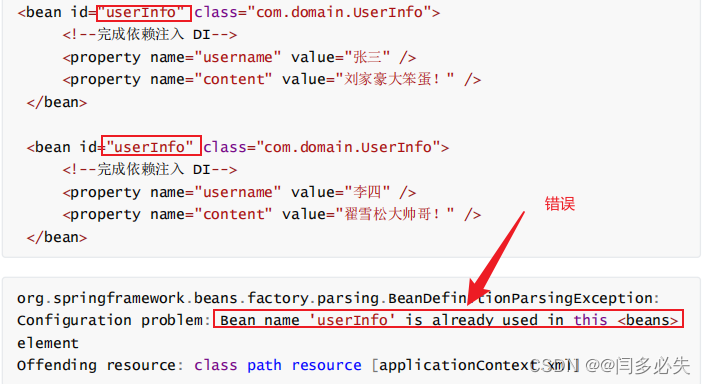 bean的id名称,在同一个配置文件下,是只能拥有一个,不能够出现重复的id名称!如果出现相同的id,则会报如下错误: