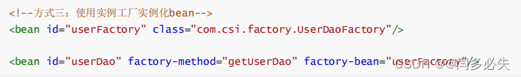 <!-- 方式二:使用静态工厂实例化 bean--><bean id = "orderDao" class = "com.csi.factory.OrderDaoFactory" factorymethod = "getOrderDao" />