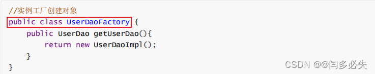 // 静态工厂创建对象public class OrderDaoFactory {public static OrderDao getOrderDao (){System . out . println ( "factory setup...." );return new OrderDaoImpl ();}}