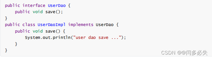 public interface OrderDao {public void save ();}public class OrderDaoImpl implements OrderDao {public void save () {System . out . println ( "order dao save ..." );}}