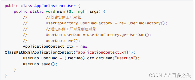 public class AppForInstanceBook {public static void main ( String [] args ) {ApplicationContext ctx = newClassPathXmlApplicationContext ( "applicationContext.xml" );BookDao bookDao = ( BookDao ) ctx . getBean ( "bookDao" );bookDao . save ();}}