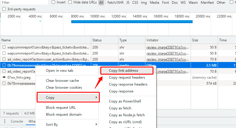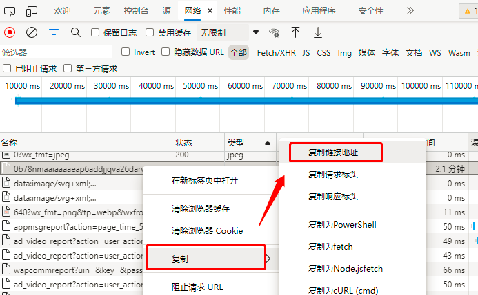 3、选中此行后,点击鼠标右键,选择【Copy】或者【复制】,再选择【Copy link address】或者【复制链接地址】如下图所示: