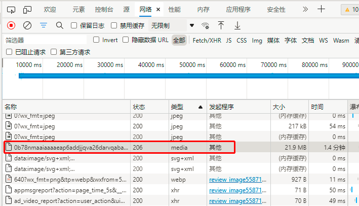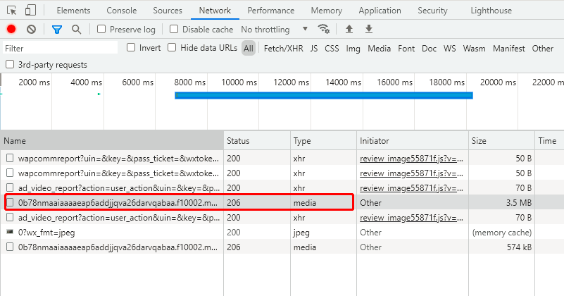 2、在弹出的窗口里选择【Network】(如果是中文的就选择【网络】),并在下面的窗口里找到 【type】或者【类型】为media的文件,如下图所示: