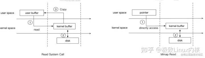 mmap除了可以减少read,write等系统调用以外,还可以减少内存的拷贝次数,比如在read调用时,一个完整的流程是操作系统读磁盘文件到页缓存,再从页缓存将数据拷贝到read传递的buffer里,而如果使用mmap之后,操作系统只需要将磁盘读到页缓存,然后用户就可以直接通过指针的方式操作mmap映射的内存,减少了从内核态到用户态的数据拷贝。