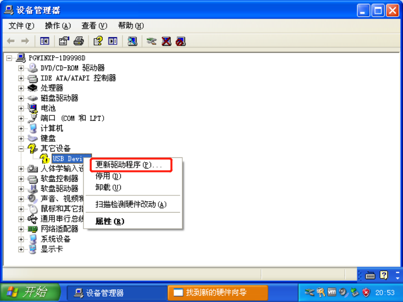 右键点击“USB Device”,选择“更新驱动程序”。