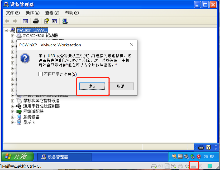 将外设插入USB口,找到虚拟机右下角的USB图标,右键选择“连接”,在弹出的对话框中点击“确定”,这样就可以将主机的外设连接至虚拟机内。
